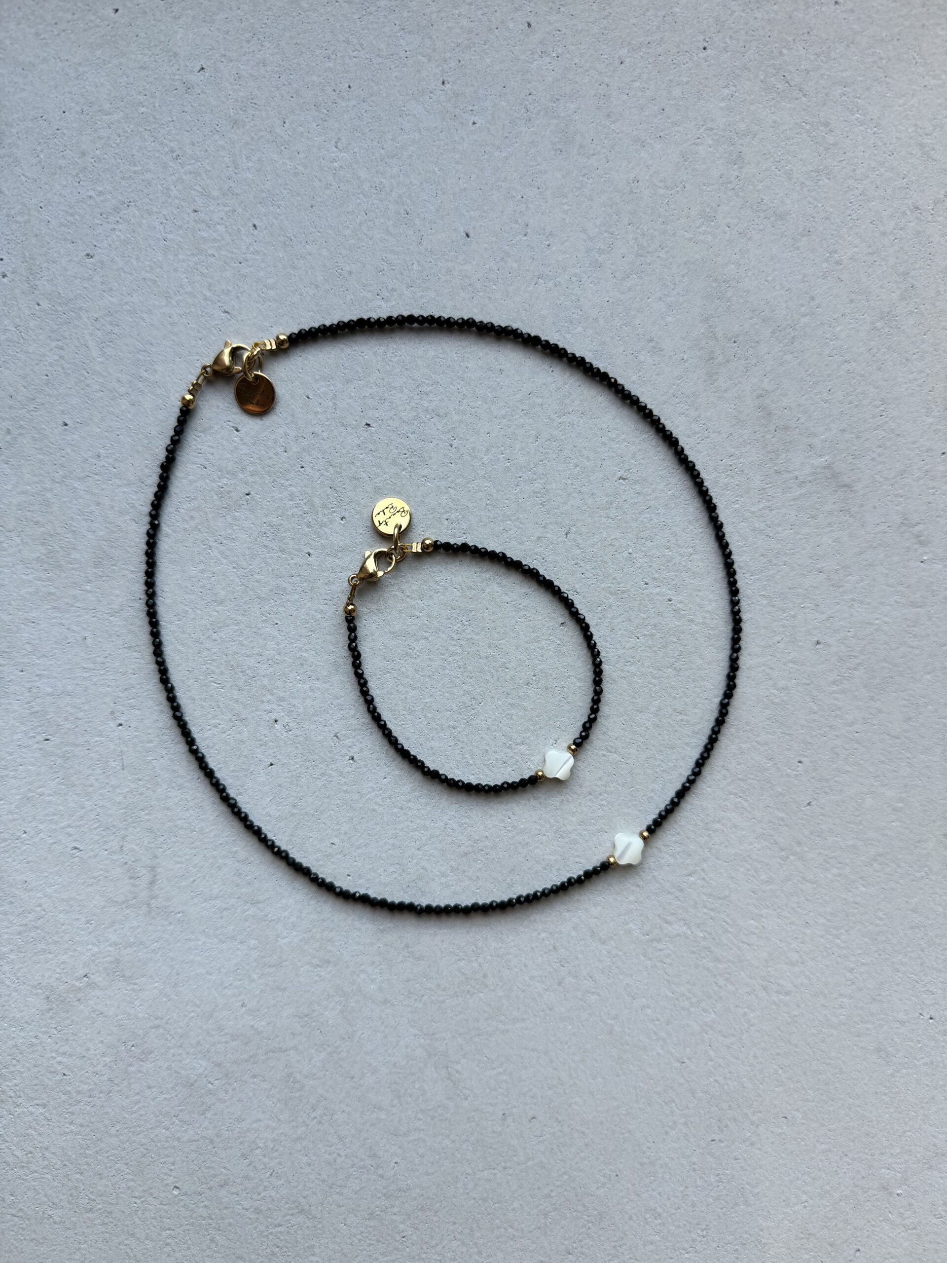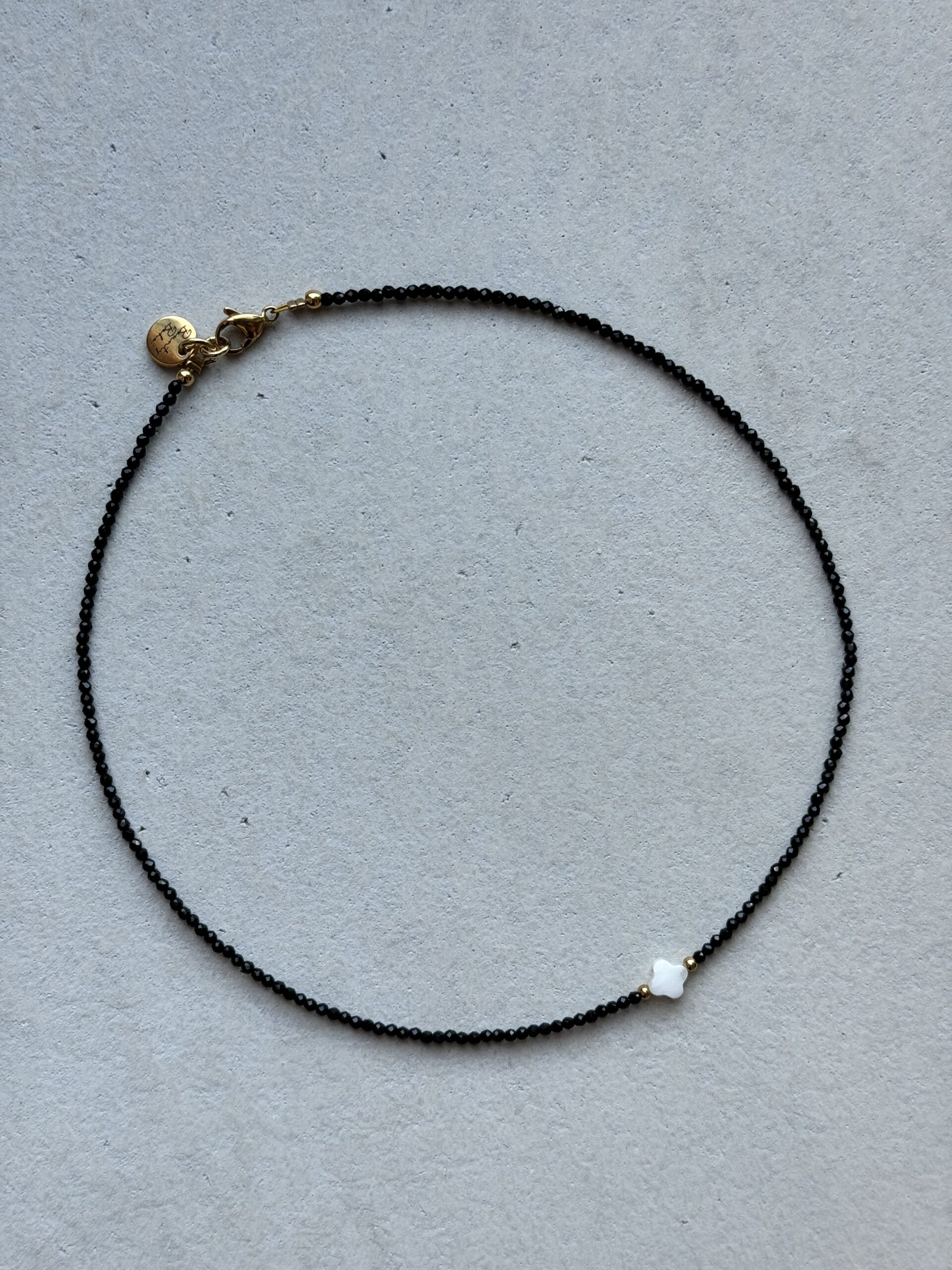 Minimalistický náhrdelník z onyxu a perlete. Dĺžka náhrdelníka je 38cm, v prípade, že si želáte inú dĺžku náhrdelníka napíšte nám to prosím do poznámky.
