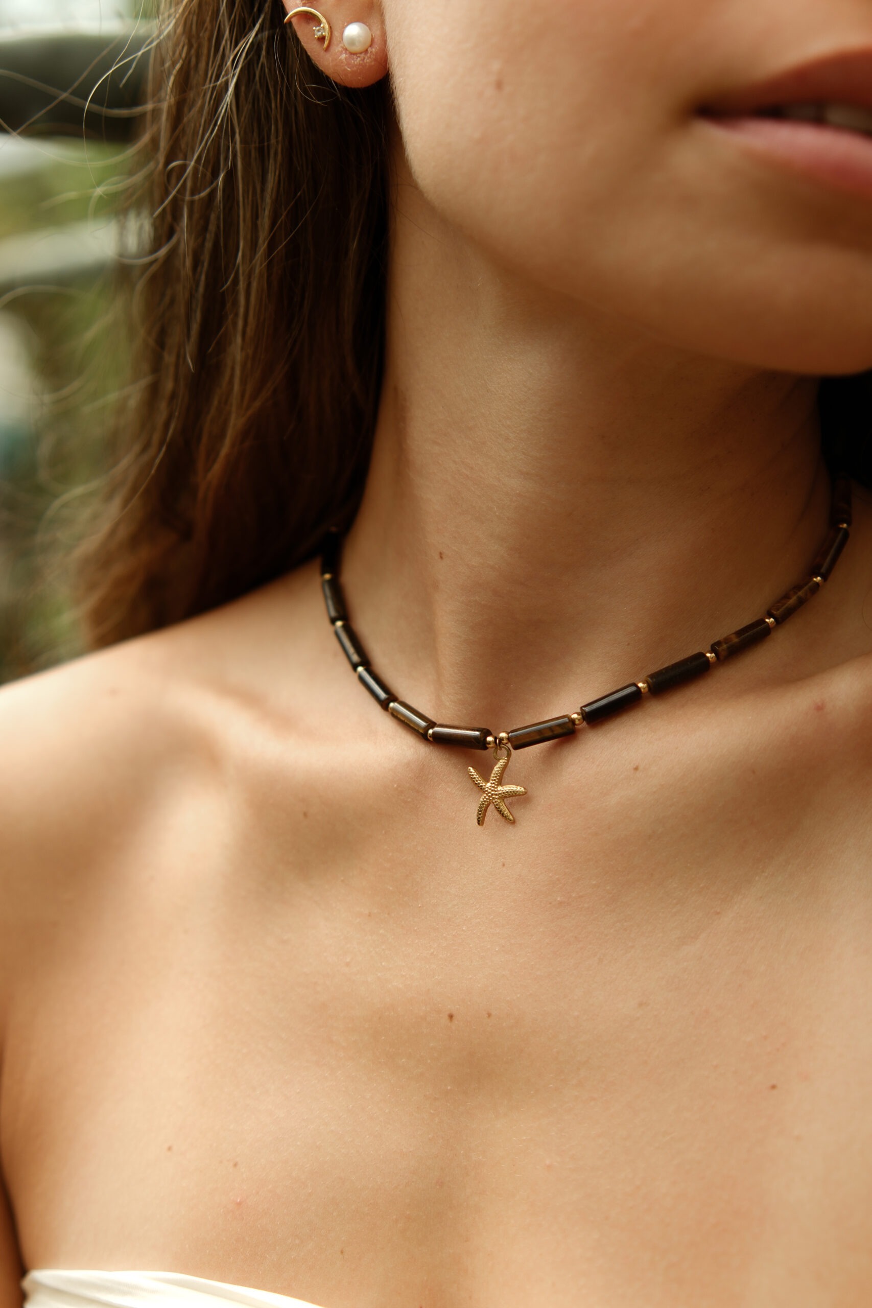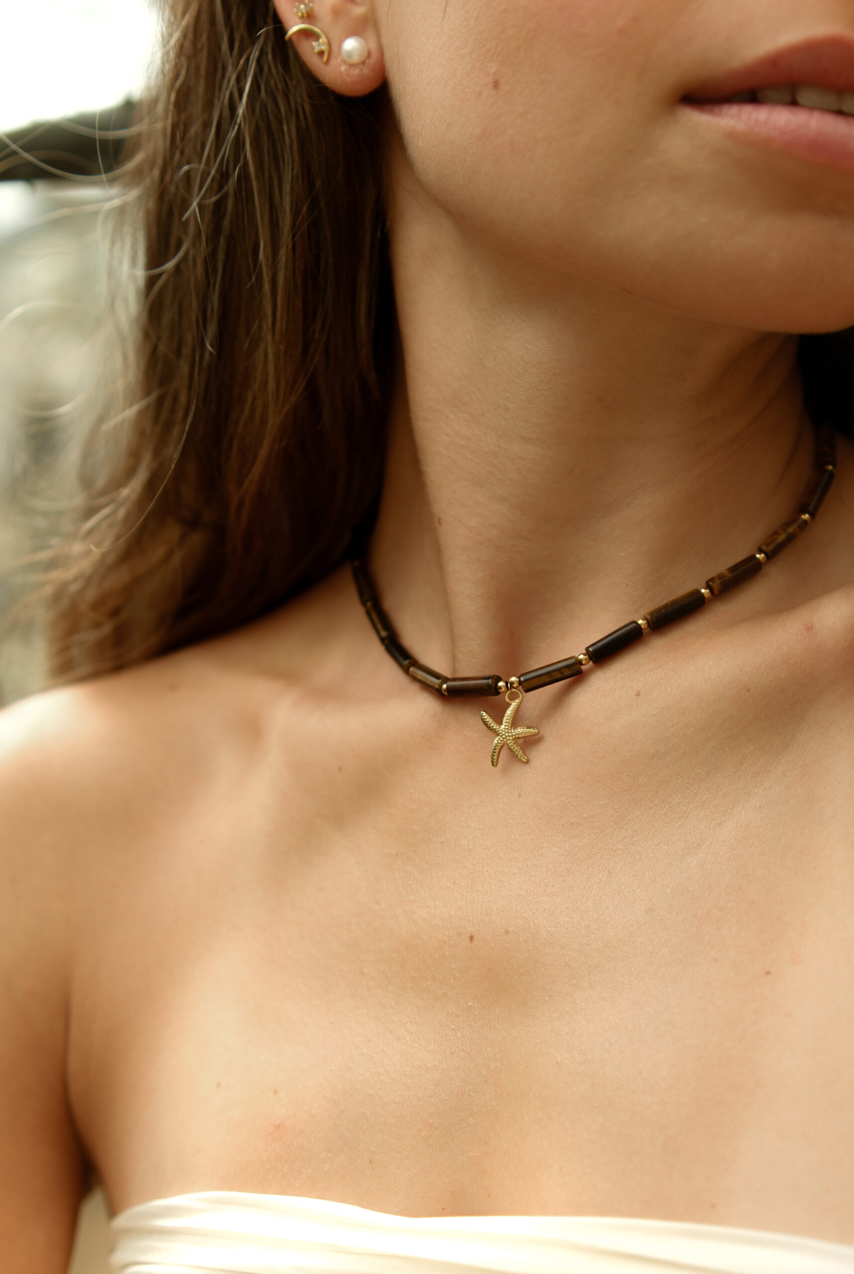 Teplé tóny tigrieho oka a hviezdica tvoria harmonický amulet plný sily, slnka a prímorskej pohody.