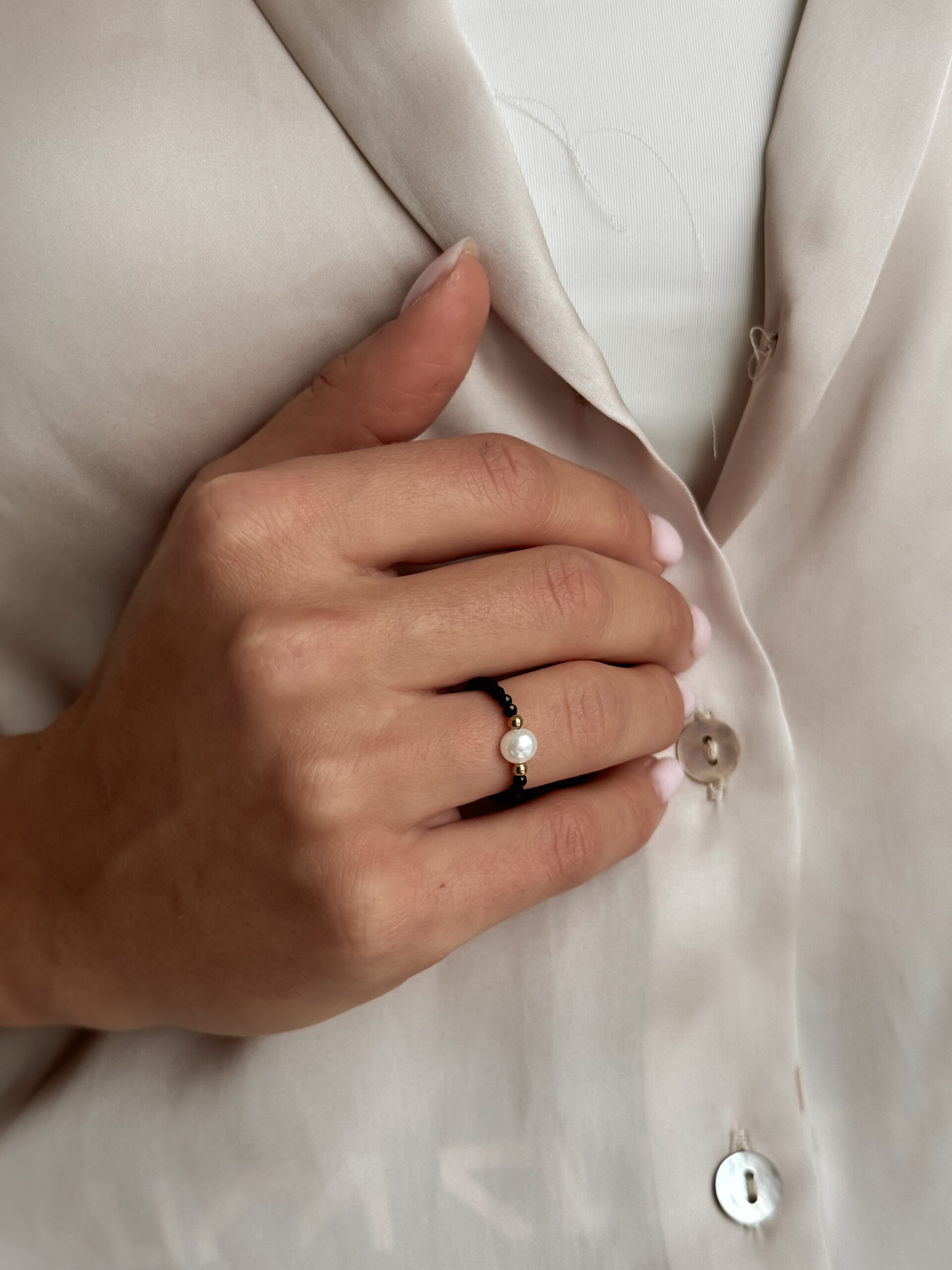 Minimalistický prsteň zo zirkónov a riečnej perly.